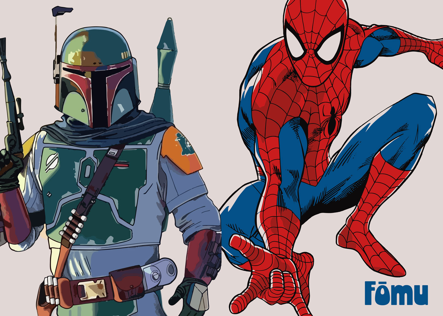 Boba Fett og Spiderman Kunstværk fra Få Mu Illustrations tilfører dit hjem en unik karakter. Dette kunstværk forener to ikoniske figurer, hvilket gør det til et perfekt valg for både børn og voksne. Du kan vælge mellem forskellige materialer, så du kan finde den stil, der passer til dit hjem: