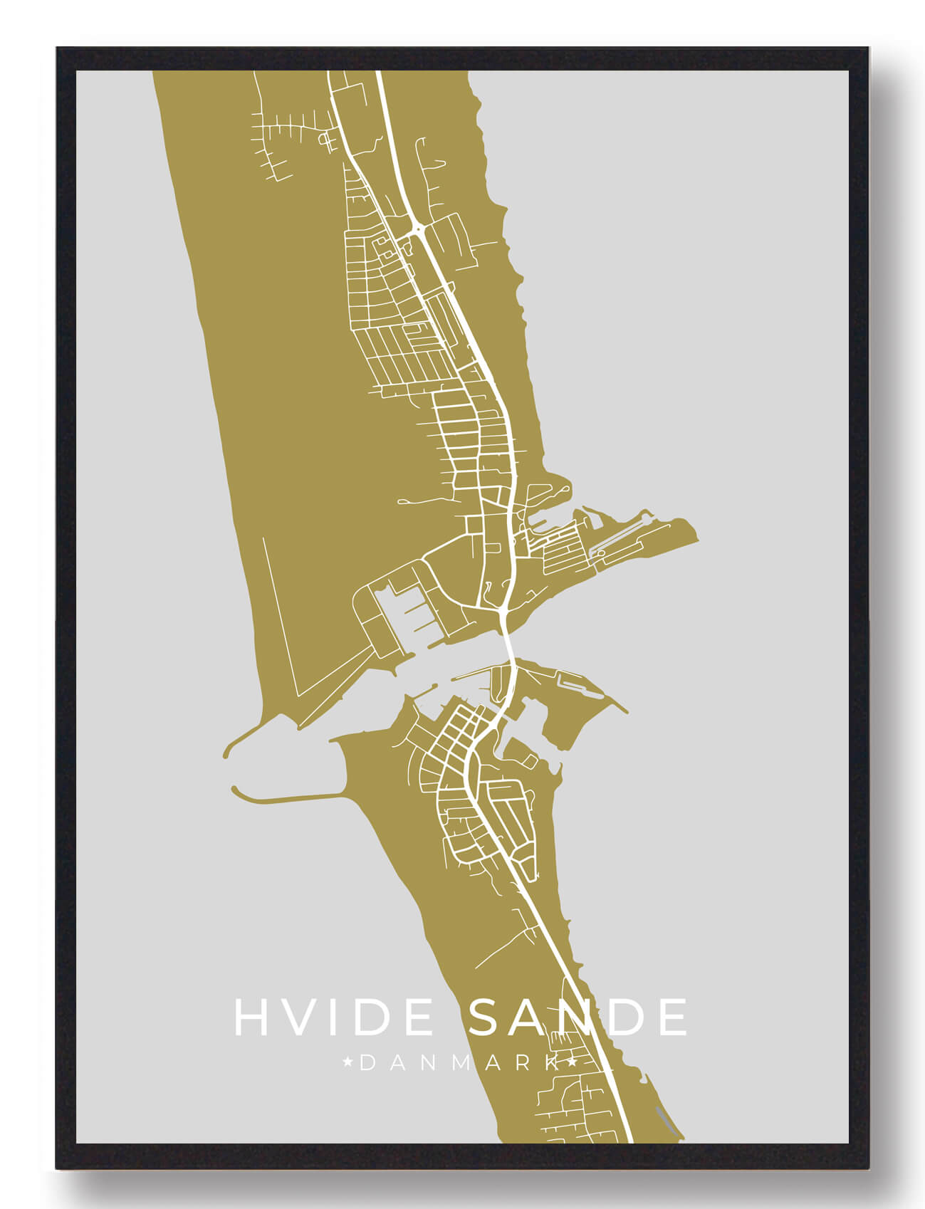 Hvide Sande Byplakat i gul er en fremragende plakat, der indfanger essensen af denne vidunderlige by i Midtjylland. Den varme gule farve tilfører lys og liv til ethvert rum