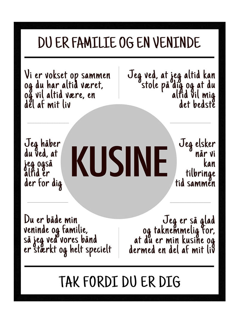 Giv din kusine en gave, der taler fra hjertet. Denne plakat er ikke bare et dekorativt element; den bærer en betydning, som hun vil værdsætte.
